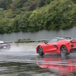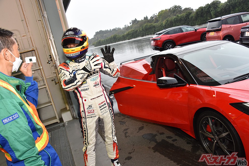 コルベットに乗り込んで、山野選手がスタート地点に向かっていく。途中、路面コンディションを確認するため、何度か発進加速を繰り返す。6.2L、V8OHVの咆哮が高速周回路に轟いた。