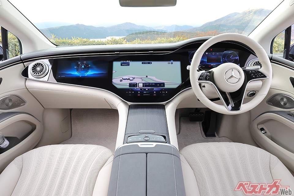 内装は先進性の塊、他メーカーの5年先を行っている。ドライバー側から助手席側へ12.3インチ、17.7インチ、12.2インチと、3つのスクリーンが広がるMBUXハイパースクリーンは圧巻。