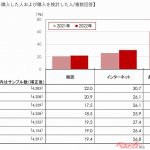 続いて、中古車購入までどのくらいの期間検討したかという問いには、平均42.7日という結果が出た。コロナ禍が厳しかった2021年はこの期間が40.4日と短かったのだが、2.3日伸びたことになる。この間の購入者の動きだが、問い合わせした店舗数は平均1.3店舗、利用したメディアは「雑誌」が22.0%、「インターネット」が30.7%で大きな割合を占めた。