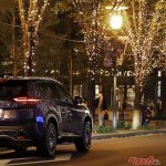 冬になると街のあちこちでイルミネーションが目を楽しませてくれるようになるが、そんな中でもエクストレイルオーテックの、どの角度から眺めても美しく輝くドットパターンのフロントグリルやブルーに輝くシグネチャーLEDを採用したフロントフェイスとの光の競演は、なかなか見応えがある。