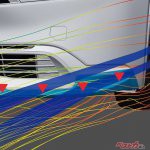 いっぽうテールゲートスポイラーは、ルーフ部分を流れてきた空気を跳ね上げ、ここでもダウンフォースを生み出す。前後ドアのガラス上部に取り付けるスポーツサイドバイザーは、車両の換気性能を高めることはもちろん、エアロスタビライジングフィンを設けることで走行安定性やステアリング応答性などの向上にも役立っているそうだ。