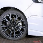 無限の手がけたデモカーも、スパーダ(プレミアムライン)がベース。エクステリアではフロントとリアのアンダースポイラー(フロントが9万3500円/リアが8万2500円)にサイドガーニッシュ(13万2000円)が組み合わされてボディ下端のボリュームがアップ、視覚的な重心が劇的に下がっている。ブラック塗装されたフロントグリルガーニッシュ(4万9500円と)とドアミラーカバーも外観を引き締めるアクセントになっている。アルミホイールは18インチのMDWをチョイスだ。