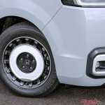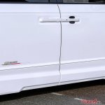 最後はモデューロが手掛けたステップワゴン・エアーのデモカー。ボディカラーも相まって非常に癒されるたたずまいとなっている。エクステリアでは、随所に仕込まれたプラチナホワイトパール+ガンメタリックのモール類がアクセント。フロントではフォグランプを覆うガーニッシュ(4万6200円)、サイドは前後ドア下部のボディサイドモール(5万9400円)、リアではボディ両端にリアコーナーガーニッシュとして配置されており、視覚的な安定感のもととなっている。これに合わせるアルミホイールは、マルチカラー塗装を施された16インチのMS-046(2万7500円/1本)だ。