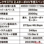 ハイランダーのボディサイズは全長4950×全幅1930×全高1730mm、ホイールベース2850mmだから、TXもそれに準じたサイズとなるだろう。