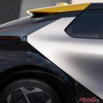 資料には、メタルシルバーに、リアドア以降、リアゲート、リアバンパーがリサイクルカーボンブラック、そしてルーフ後端およびフロントスポイラーの一部、リアディフューザーの一部がサルファー(資料にはsulphur=硫黄。明るい淡黄色)の3色と書いてある。