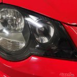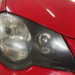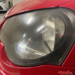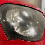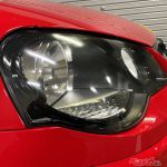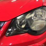 さっそく、15年落ちの真っ赤なVWポロGTI(MT)のお出ましでございます。ぎょえー、かなり黄ばんでぎょざいます。赤いボディはそこそこキレイなのに、黄ばんだヘッドライトで台無しですね。施工する前に念のために、ヘッドライトがガラス製じゃないことを確認。対象車は樹脂製ヘッドライトです。