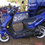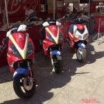 こうなると日本チームのスクーターも気になるところだ。撮りためた写真を隅から隅まで探して見つけたのが、三菱ワークスのスクーターだ。ランサーエボリューションのワークスカラーそのもののカラーリングは、かなりかっこいい!