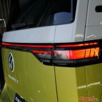 フロント周りに開口部はほとんどなく、バンパー部分にメッシュ状の空気取り入れ口があるのみ。ここには運転支援のためのミリ波レーダーやソナーも備えられていた。ライト周りは前後ともVWおなじみの「IQ.LIGHT」で、ハイビームの配光制御のほか多彩な表示も行う。車両を起動するときはアニメーションのように光が動き、ID.BUZZの意志のようなものを感じてしまった。