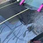 続いて、ボンネット中央には親水タイプの「ペルシードハイドロショット180(3298円)」。こちらは「洗車後に水滴を軽く拭き取ってください。その後、1秒の噴射で80cm四方の施工が目安です。専用のクロスで塗り広げるように拭き上げてください」と書いてあったので、その通りに拭き上げていった。