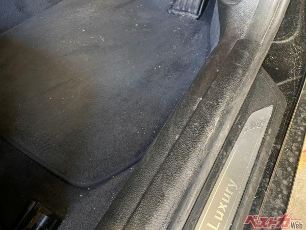しかも本革ステアリングが手垢でツルツル、本革シートは運転席のサイド部分は擦れ汚れで黒ずみ、コンソールには左肘を置いているため、ここも黒ずんでいます。
