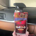 続いて、ダッシュボードやエアコン吹き出し口、ドア内貼りなど、プラスチック、合成皮革、ゴムなどに使う、汚れ落とし&保護艶出しです。