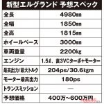 重量級のエルグランドに対応するために204ps/30.6kgm、モーター出力は180~190ps程度にパワーアップを果たしそうだ。