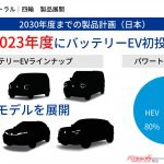 注目は発表されたパワーポイントの資料。その資料には2023年度までにBEVを投入し、2030年度までに6車種展開という見出しと6つのモデルのシルエットが描かれている。