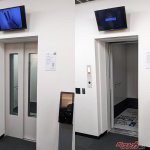 今回の実験に使用された日立ビルシステムのオフィスエレベーター(シートマットに今回の企画が描かれている)。停電時に配電盤を操作すると、低速運転でエレベーターが動く。ビルやマンションの管理人さんが操作可能だそう
