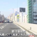大橋ジャンクションを駆け上がってくる大量のクルマが、3号渋谷線下りへと合流する地点は、渋滞が頻発する筆頭エリアのひとつ。合流車線は比較的長めにとられているが、車線規制ポールを過ぎた直後のポイントは、我先に合流を仕掛けるクルマが多く、車両接触事故や追突事故が発生しやすい。