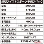 正常進化する新型スイスポは全長3990×全幅1750×全高1500mmで、現行より若干大型化されるが充分許容範囲。デザインはよりシャープな雰囲気を身にまとう。